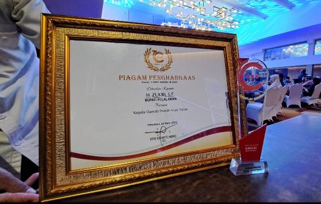 Penghargaan tersebut diterima langsung oleh Asisten Pemerintahan dan Kesejahteraan Rakyat Sekretariat Daerah Zulkifli mewakili Bupati Pelalawan, pada acara puncak Hari Ulang Tahun (HUT) ke-7 media siber online cakaplah.com.