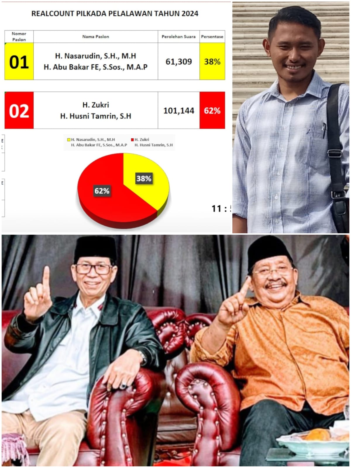 Pangkalan Kerinci – Pasangan calon (Paslon) Bupati dan Wakil Bupati Pelalawan, H Zukri dan Husni Tamrin, berhasil meraih kemenangan telak dalam Pilkada Pelalawan 2024. Hasil quick count koalisi menunjukkan bahwa mereka unggul dengan perolehan suara sebesar 62 persen, jauh meninggalkan pasangan Nasaruddin dan Abu Bakar yang hanya meraih 38 persen.