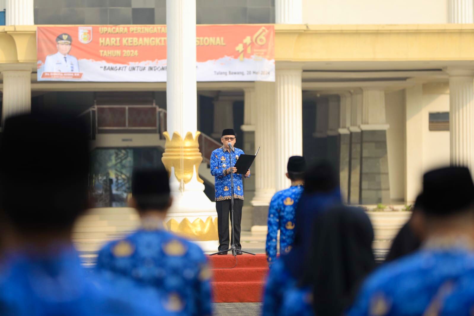 Tulang Bawang – Pj Bupati Tulang Bawang Drs.Qudrotul Ikhwan.,MM diwakili Pj.Sekdakab Tuba Bapak Ferli Yuledi.,SP.,MT.,MM memimpin upacara peringatan ke-116 Hari Kebangkitan Nasional yakni Kebangkitan Kedua Menuju Indonesia Emas, di Halaman Kantor Bupati Tulang Bawang.