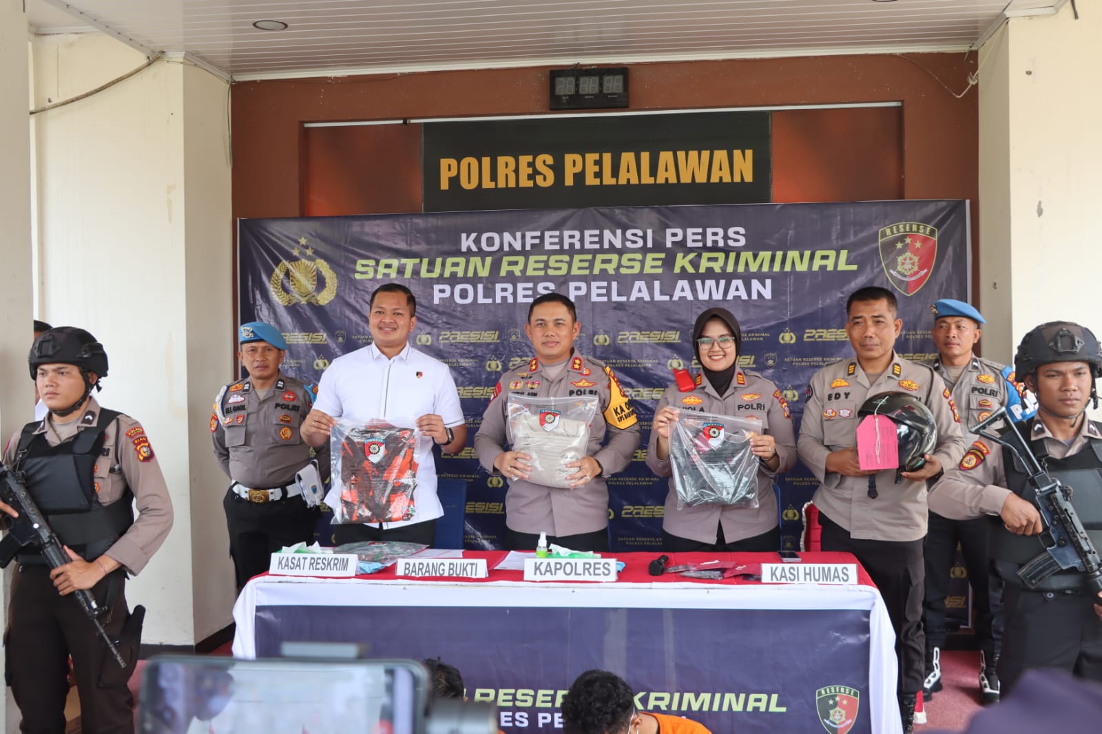 PELALAWAN – Kapolres Pelalawan AKBP Afrizal Asri SIK, bersama Kasat Reskrim AKP Kris Tofel STrK SIK, Kapolsek Pangkalan Kerinci AKP Viola Dwi Anggraeni SIK, dan Kasi Humas AKP Edy Haryanto SH MH, menggelar konferensi pers pada Senin, 2 September 2024, mengenai pengungkapan kasus pembakaran mobil Toyota Avanza milik Samsul Simorangkir. Peristiwa ini terjadi pada 20 Agustus 2024 di Perumahan Graha Pelalawan, Desa Makmur, Kecamatan Pangkalan Kerinci.