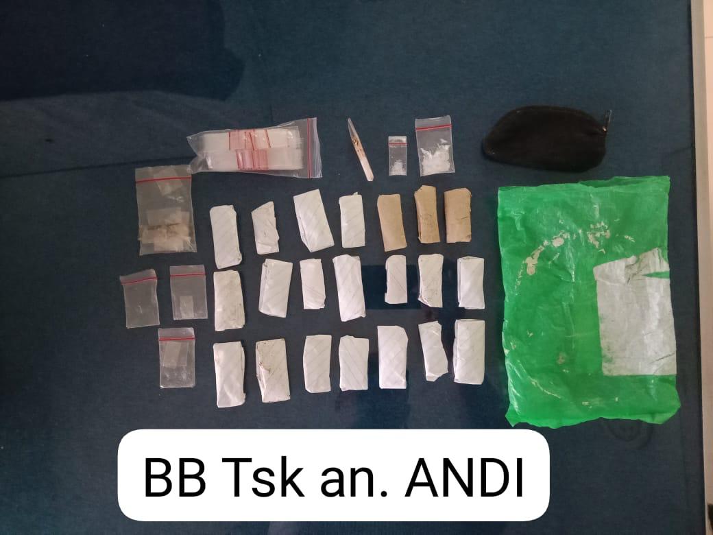 Saat diperiksa, Petugas berhasil menemukan barang bukti berupa 1 (satu) buah plastik klip transparan ukuran sedang berisi Narkotika Shabu dengan berat brutto 0,96 gram, 1 (satu) buah plastik transparan ukuran kecil berisi Narkotika Shabu berat brutto : 0,20 gram, 21 (dua puluh satu) ampun/bungkus daun ganja kering, 1 (satu buah pipet kecil berbentuk skop, 3 (tiga) buah plastik klip ukuran sedang bekas Shabu, 1 (satu) buah plastik klip ukuran besar bekas Shabu, 1 (satu) bungkus plastik klip transparan berisi 30 (tiga puluh) buah plastik klip ukuran kecil kosong, dan 1 (satu) buah dompet kain warna hitam.
